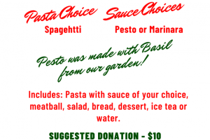 Tickets include pasta and sauce of your choice, meatball, bread, salad, dessert, ice tea or water. The pesto sauce is made with basil from the church's garden!