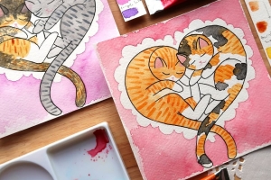 Paint two adorable cats as part of a Valentine's beginner friendly watercolor class, focusing on simple techniques. Paint them to look like your own, use one of the provided examples, or just wing it and paint what feels right.