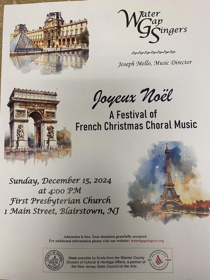 Joyeux Noel! Swing into the holiday season with the Water Gap Singers, who will be sharing a wonderful afternoon of French Christmas music under the direction of Joseph Mello. Free - with goodwill offerings gratefully accepted - and a reception after the performance.