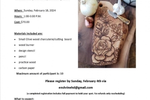 Learn the art of wood burning, also known as pyrography, with Robin of EnShrine Design. During this class, each participant will create a wooden board with choice of two stencils.