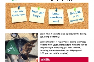 Puppy power! Learn what it takes to raise a puppy for the Seeing Eye. Bring the family! Warren County 4-H PuppyPower Seeing Eye Puppy Raisers invite youth AND adults to meet the club as they teach you everything you need to know, including information about the 4-H program!
