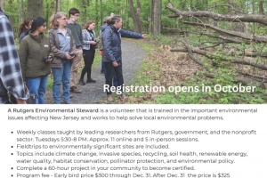 A Rutgers Environmental Steward is a volunteer trained in the important environmental issues affecting New Jersey and work to help solve local environmental problems. No previous experience needed.