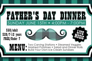 Chef's Catering is wishing all fathers a special day by firing up the grill with Prime Rib, Au jus, horseradish cream, salad bar, baked potato, kids menu, cash bar (Dine-in Only). Dads receive 1 free beer or wine.