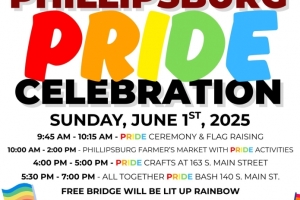 First Phillipsburg PRIDE Celebration! PRIDE Flag Raising at Shappell Park, 9:45-10:15am; PRIDE Activities at the Phillipsburg Farmers Market, 10am-2pm; PRIDE Crafts at 163 S. Main St, 4-5 pm; PRIDE Bash at 140 S.