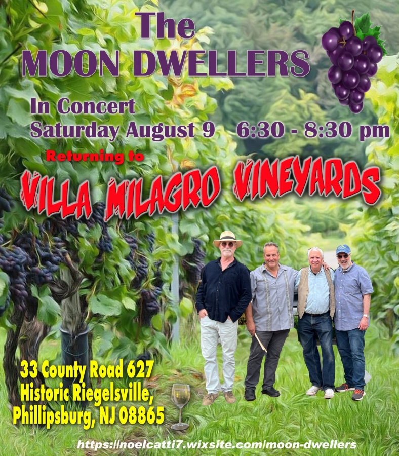 The Moon Dwellers, a local Hunterdon County band of three talented musicians, performs New Orleans, Blues, folk-rock plus originals. Wear your dance shoes and pack a picnic. Wine by bottle. Advance tickets $15. At door $20. Tickets guarantee table/chairs.