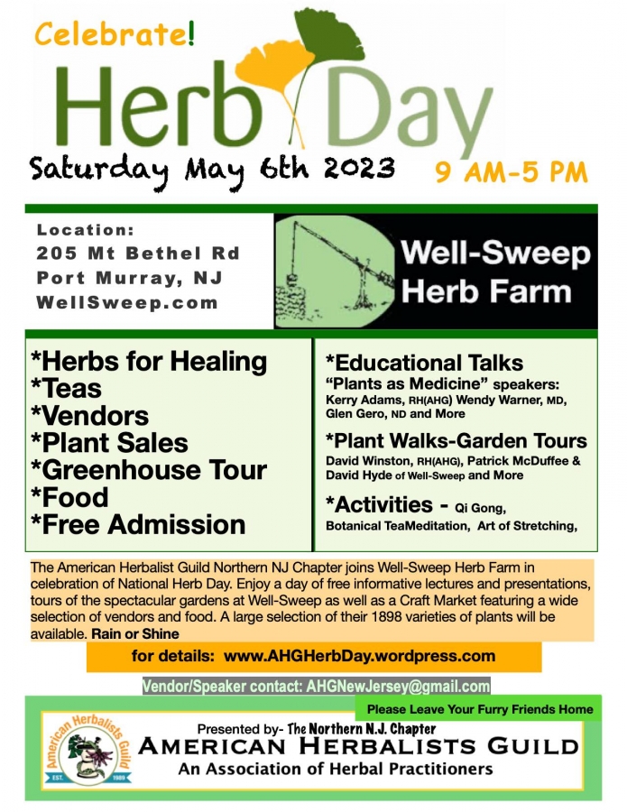 Enjoy a day of free informative lectures and presentations, tours of spectacular gardens, as well as a Craft Market featuring a wide selection of vendors and food, and a large selection of 1,898 varieties of plants will be available. Full slate of featured speakers in partnership with the American Herbalist Guild of NJ.