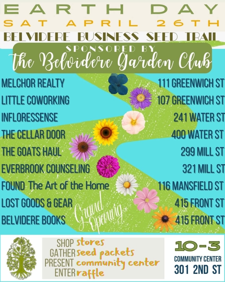 Sponsored by the Belvidere Garden Club! Visit all nine participating buisnesses listed on the flyer (including the Grand Opening of Belvidere Books and Lost Goods & Gear), collect seed packets from each one, then bring your seed packets to the Community Center @ Belvidere (301 Second St.) by 3pm to enter a Grand Prize drawing!