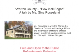 Gina Rosseland of Warren County Land Preservation's Division of Cultural and Heritage Affairs will be giving a talk on the beginnings of Warren County, appropriate for the County's Bicentennial year. This is free and open to the public. Light refreshments will be served.