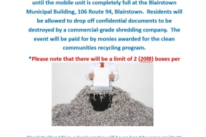 Blairstown residents, drop off your confidential papers to be shredded by Absolute Shredding. Limit 2 20lb. boxes per person. Open until the mobile unit is full.