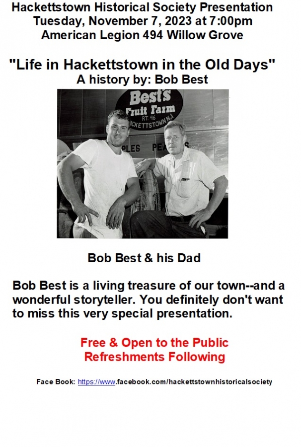 Bob Best, a Hackettstown native, is a wonderful storyteller who will be giving a presentation on the history of Hackettstown.