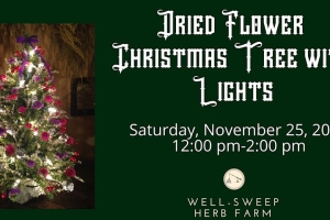 Create a beautiful 12” miniature Christmas tree with tiny lights and flowers to decorate your table for the upcoming holiday. Start with an artificial pine tree and cover it with a string of lights, adding accents of dried flowers grown at Well-Sweep for a fully adorned masterpiece.