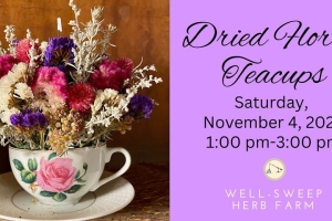Bring two cute teacups from home or from thrifting for a fun afternoon of decorating them with dainty dried flowers. Enjoy a cup of herbal tea and some herbal refreshments while Louise teaches the art of miniature dried flower arrangements.
