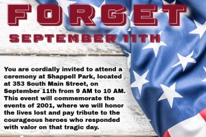 The public is invited to commemorate the events of 9/11/2001 by coming together for a ceremony to stand together in solidarity to remember, reflect and reaffirm a commitment to unity and resilience in the face of adversity. Music and refreshments will be provided.