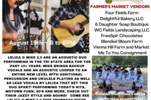 Restaurant, Brewery and retail specials throughout town, plus the Farmers Market and Live Music with Lelica and Mike 2.0, an acoustic duo performing today's hits, Motown Funk, 90's and more! Music and market are at 232 Main Street.