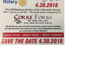 Support the Phillipsburg Rotary Club for their 11th Annual Corks Forks of the Valley. Cost is $60.00 per person for wine, beer and food tasting. There will be food from some restaurants, wine by Bourbon St. Wine and Spirits, and beer by Weyerbacher.