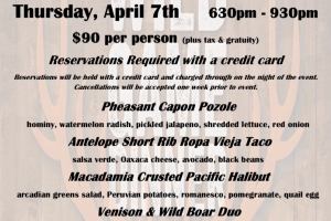 Join Buck Hill for a delicious dinner featuring wild game, with pheasant, antelope, venison and wild boar on the menu!