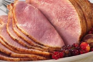 Indulge in juicy ham with pineapple sauce, flavorful stuffing, tender parsley potatoes, savory green beans, sweet applesauce, and a delightful dessert.