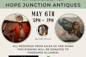 May welcomes self-taught artist Linda Feula whose work is described as collage and mixed media environmental. All the proceeds from sale are going to the Foodshed Alliance. A reception will be included.