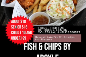 Sponsored by Mt. Lake Fire Company and the Ladies Auxiliary comes a take out dinner made by Argyle. This meal will consist of fish or chicken, fries, coleslaw and dessert. Pre-ordering is required by calling 908-475-2036.