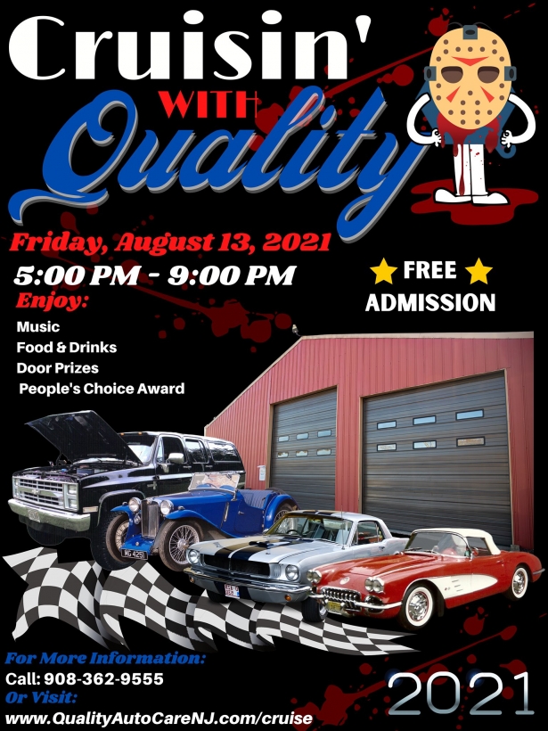 It's Friday the 13th, so guess who will be walking around this very special Cruisin' with Quality Event ? You guessed it! Get a photo with Jason Voorhees in front of your car! Enjoy food, music, and nice rides in beautiful Blairstown. Door prizes announced every half hour up to 8pm, when the People's choice award will be announced.