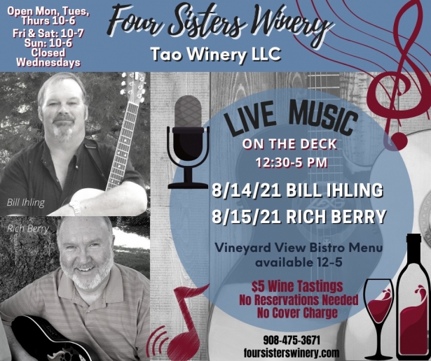 Come enjoy the beautiful view and live music on the deck with Bill Ihling on Saturday and Rich Berry on Sunday. $5 wine tastings and no reservations required. Vineyard View Bistro menu available.