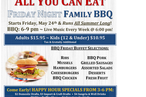 Kick off your weekend each Friday with an "All You Can Eat" Friday Family BBQ! Enjoy live music, delicious summer eats and BBQ, ice-cold cocktails & beverages, all while enjoying our gorgeous panoramic golf course scenic views.