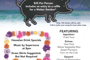 Hurry and make your pre-paid reservation! Only 100 tickets will be sold for this Hawaiian Luau with Cuban-style pig roast. $35/person, two seatings.
