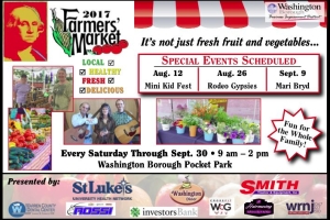 Join us each Saturday through September 30 for the annual Washington Borough Green Team Farmers' Market, featuring a dozen farmers and artisans! Special activities will also include live music, face painting, and more. Rain or Shine.