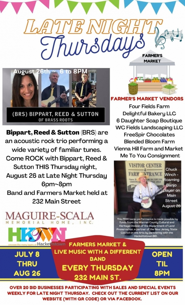 We may want to believe that summer will last forever, but in fact Labor Day is just around the corner and outdoor summertime activities are winding down. While there are some great events coming up in September, if you’ve been meaning to get to a free outdoor concert, or to check out Friday Nights at Donaldson Farms, you have only a couple more chances to do so! Plus, there is just one more Late Night Thursday in Hackettstown (tomorrow), so get moving! (Or get exploring, as we like to say around here.)