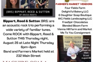 Restaurant, brewery and retail specials throughout town, plus a Farmers Market and live music. This final Late Night Thursday of the season features Bippart, Reed and Sutton (acoustic rock trio), and roaming banjo player, Chuck Winch. Music and market are at 232 Main Street.