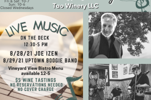 Come enjoy the beautiful view and live music on the deck with Joe Izen on Saturday and Uptown Boogie Band on Sunday. $5 wine tastings for up to 8 wines and no reservations required. Wine will be available for purchase by the glass or bottle along with our Vineyard View Bistro Menu.