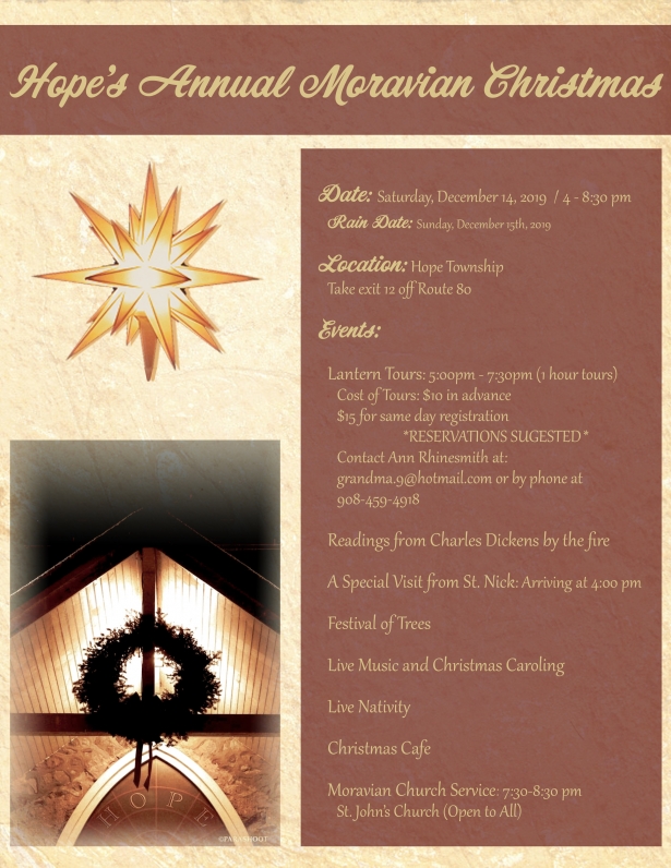 Starting with a visit from St. Nicholas and ending with a traditional Moravian candlelight Christmas service, the Historic Village of Hope welcomes visitors for its annual Moravian Christmas. Lantern tours (reservations suggested), musical performances and caroling, a Festival of Trees, a fireside reading from Charles Dickens’ A Christmas Carol, live nativity, and much more.
