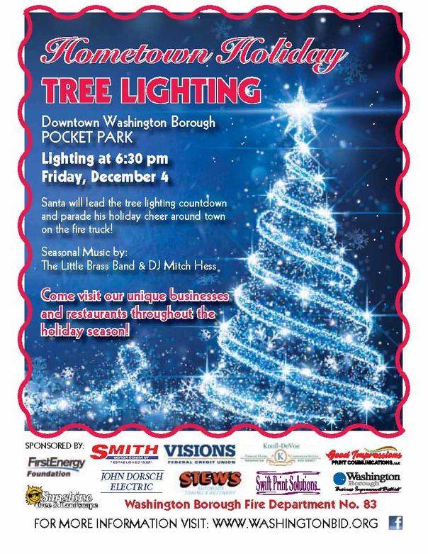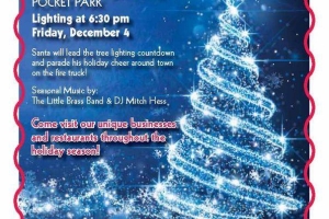 Tree lighting in the Pocket Park at 6:30pm, and music by The Little Brass Band and DJ Mitch Hess.