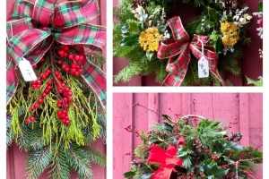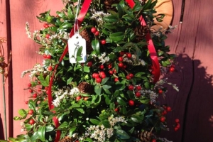 Create a long-lasting festive tree for your holiday table using fresh boxwood, holly and assorted winter greens. You will then decorate with pine cones, stars, ribbon and other novelties. Completed height approximately 18″. One of our most popular evergreen pieces. Bring clippers.
