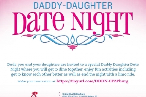 Dads, do you want a fun night with your daughter(s)? Come to Chick-fil-A for a special Daddy Daughter Date Night where you will get to dine together, enjoy fun activities including get to know each other better as well as end the night with a limo ride around the mall in a stretch limo.