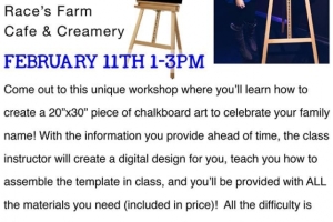 Come to Race Farm Cafe & Creamery for a unique workshop where you’ll learn how to create a 20”x30” piece of chalkboard art on an art board (like the one pictured) to celebrate your family name!