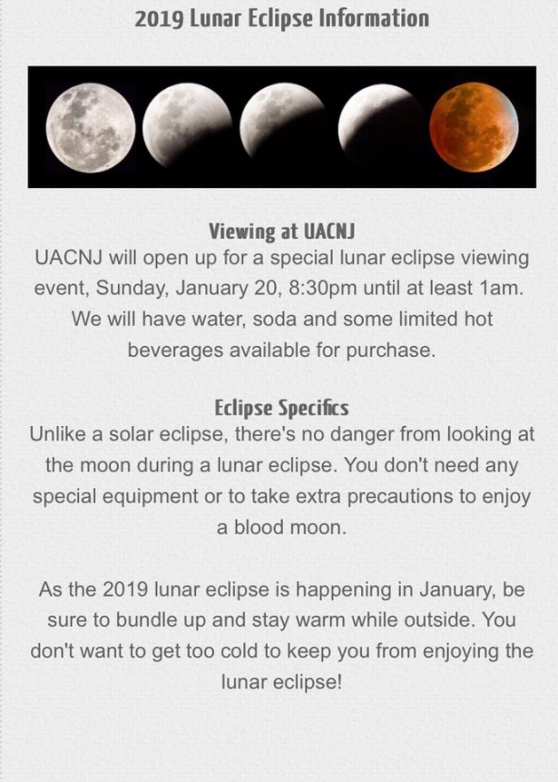 This weekend you will get one of the best chances to see a total lunar eclipse, a spectacular astronomical event during which the moon turns red – and is therefore also known as a blood moon. The eclipse during the evening of January 20 will last for several hours, with the spectacular red-colored totality lasting about an hour in the middle of the event. It caps a weekend full of music, art and cooking events you'll find as you read on. And don't forget to check out the Plan Ahead section to get in on some great upcoming activities! Happy Wanderings!