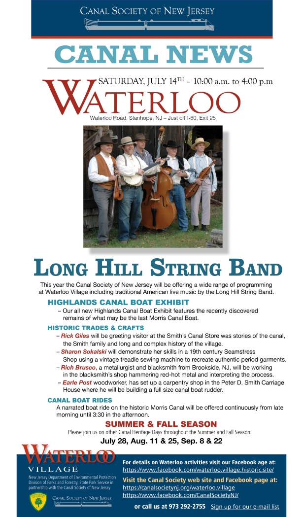 The Canal Society of New Jersey offers a wide range of programming at Waterloo Village this year including the new Highlands Canal Boat Exhibit featuring the recently discovered remains of what may be the last Morris Canal Boat. Some of the historic buildings will be open, historic trades & crafts will be demonstrated, and there will be canal boat rides.