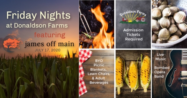 Introducing Friday Nights at Donaldson Farms featuring James Off Main! This week's musical guest is The Bombed Opera Band. Relax and enjoy delicious food and live music outdoors while surrounded by the stunning views of growing crop fields and mountain vistas. Bring your own adult beverages if you wish. Tickets are required to enter the event whether or not you plan to purchase food; all food is sold separately.