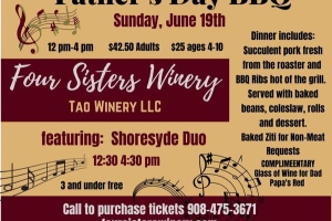 Roasted pork and ribs are the focus of this day at the winery celebrating all dads. Dinner includes succulent pork fresh from the roaster and bbq ribs hot off the grill, baked beans, coleslaw, rolls and dessert. Baked ziti will be available for the non-meat meal.