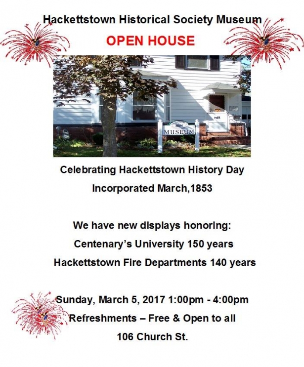 Celebrate the rich history of a town incorporated in 1853. Free and open to all, with refreshments, at the Hackettstown Historical Society Museum, with displays honoring 150 years of Centenary University's history, and 140 years of Hackettstown Fire Department history.