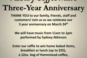Asbury Coffee is celebrating their 3 year anniversary and wants you to celebrate with them! Music performed by Sydney Atkinson. Enter a raffle to win a prize!