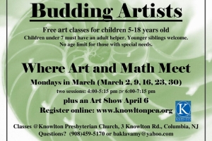 Budding Artists' spring session of classes (Where Art and Math Meet) is open for registration for kids ages 5-18. These free classes meet Mondays in March. Choose a time: 4-5:15pm or 6-7:15pm.