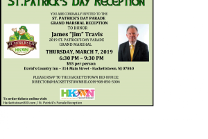 The Hackettstown BID kicks off parade weekend with a Grand Marshal Reception to honor 2019 St. Patrick’s Parade Grand Marshal, James "Jim" Travis. The reception dinner will be held at David's Country Inn.