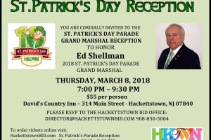 The Hackettstown BID kicks off parade weekend with a Grand Marshal Reception to honor 2018 St. Patrick’s Parade Grand Marshal, Ed Shellman. The reception dinner will be held at David's Country Inn featuring live pipes, drums and a dance performance by Slattery School of Irish Dance.
