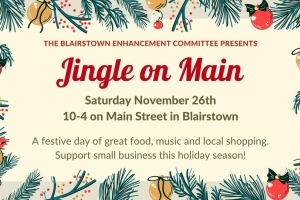 Jingle on Main is a festive Small Business Saturday event featuring over 50 local vendors, food and music, presented by the Blairstown Enhancement Committee and held throughout Blairstown's Historic Main Street.
