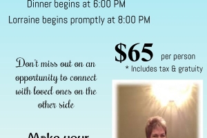 Dinner begins at 6 pm; Lorraine begins promptly at 8 pm. Connect with loved ones "on the other side." $65/person. Make your reservation!