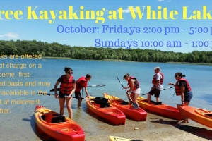 Enjoy free kayaking at Warren County's White Lake Natural Resource Area every Friday and Sunday in October. Kayaks are offered free of charge on a first-come, first-served basis, and may be unavailable in the event of inclement weather.