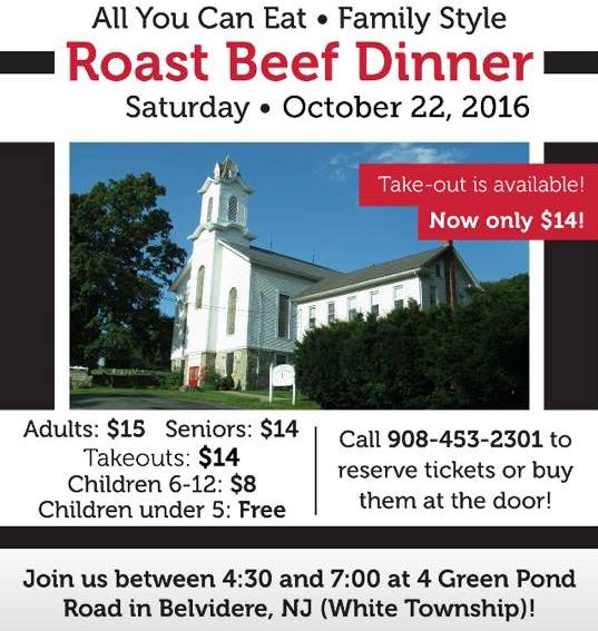 All-you-can-eat Family Style Roast Beef Dinner with assorted desserts. Call ahead and leave message to reserve tickets, or buy them at the door. Take-outs and Adults: $15; Seniors: $14; Kids age 6-12: $8; Kids age 5 and younger: Free. 908-453-2301.