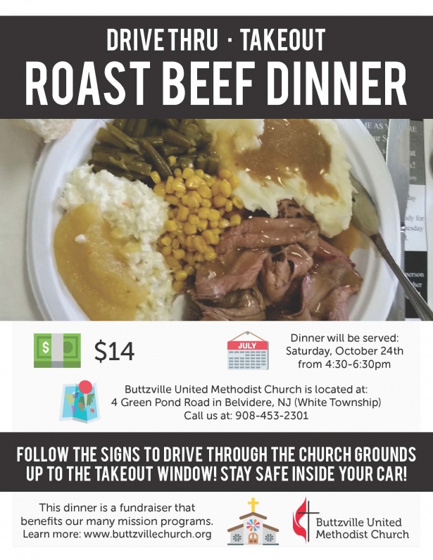 Take-out only Roast Beef dinner with browine dessert. $14 per meal. Stay safe inside your vehicle! Please drive in the back (cemetery entrance) to payment station near the clothing shed, then proceed to the take-out window where a runner will take your tickets and bring your to-go bags to you. 908-453-2301.